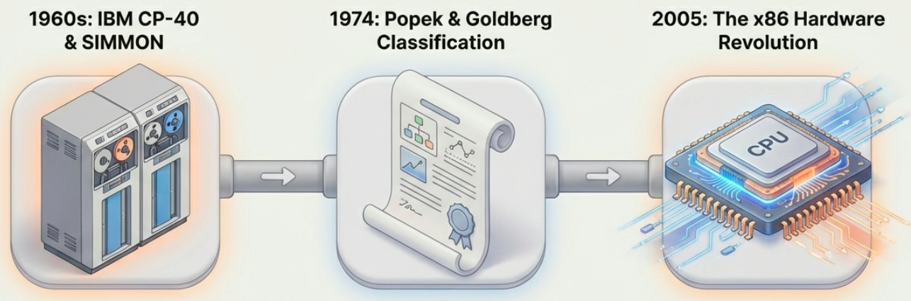 - 1974: Gerald J. Popek and Robert P. Goldberg published Formal Requirements for Virtualizable Third Generation Architectures, which established the classic classification of Type 1 and Type 2 hypervisors.