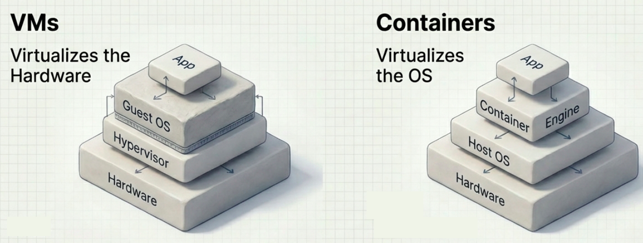 - Containers (like Docker) virtualize the operating system, splitting a single machine into segregated logical namespaces. Containers do not include a full operating system; they only pack the specific dependencies required to run an application, making them start up in milliseconds.