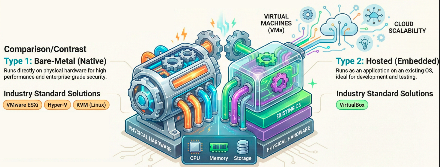 - Microsoft Hyper-V: A Type 1 hypervisor integrated with Windows Server and Azure. It is highly favored by businesses heavily invested in the Microsoft ecosystem.