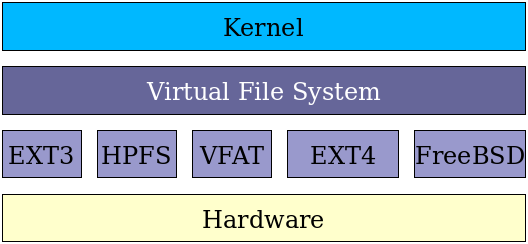 - When an application needs to access a file, it interacts with the VFS abstraction layer, which then translates all the I/O system calls (reading, writing, etc.) into specific code relevant to the particular actual filesystem. Thus, neither the specific actual filesystem or physical media and hardware on which it resides need be considered by applications. Furthermore, network filesystems (such as NFS) can be handled transparently.