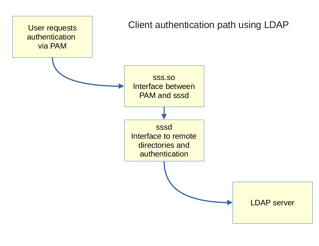Section titled “LDAP Client Authentication Process”The graphic shows the information path used by LDAP/SSSD. Connecting to an LDAP server starts with PAM, the pluggable authentication module.