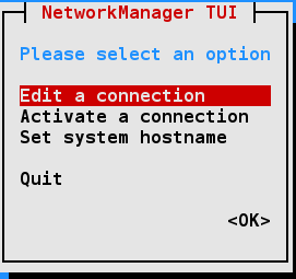 nmcli : If you need to run scripts that change the network configuration, you will want to use nmcli (network manager command line interface). Or, if you are a command line junkie, you may want to use this instead of nmtui.