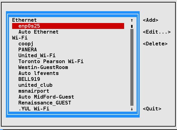 nmtui and ncurses : If you are making a configuration change on your system that is likely to last for a while, you are likely to use nmtui (network manager text user interface), as it has almost no learning curve and will edit the underlying configuration files for you. It uses the ncurses library interface.