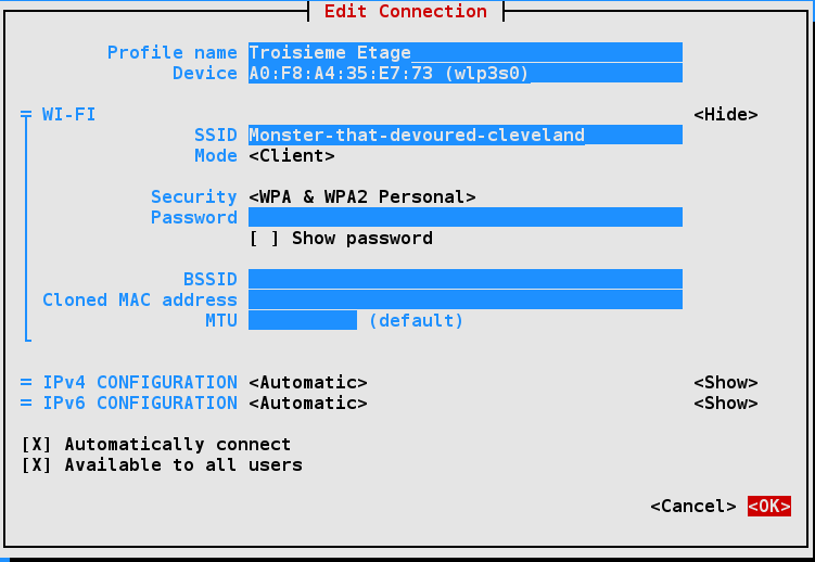 The nmtui menu for wireless networks should look similar to the GUI interface. Sometimes it’s useful to use this interface to view configurations for other wireless networks while configuring a new one.